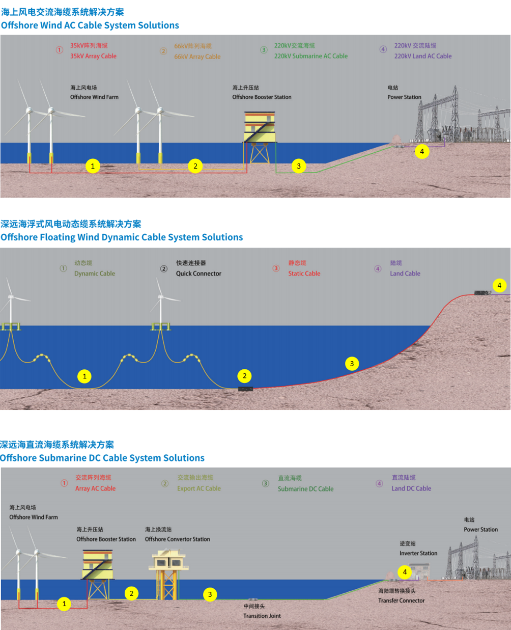 海上風電系統解決方案為客戶的海上風電提供從產品設計、生產制造、附件配置、敷設安裝以及運維等全系列的系統解決方案。主要提供海上風機間的區間海底電纜,以及高壓及超高壓的輸出海底電纜,同時配套附件、終端、接頭、機械保護等。